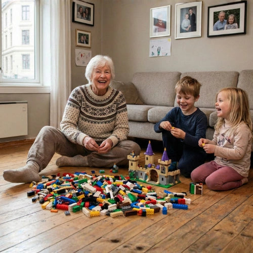 Leke med barnebarna på gulvet